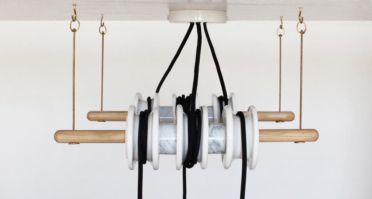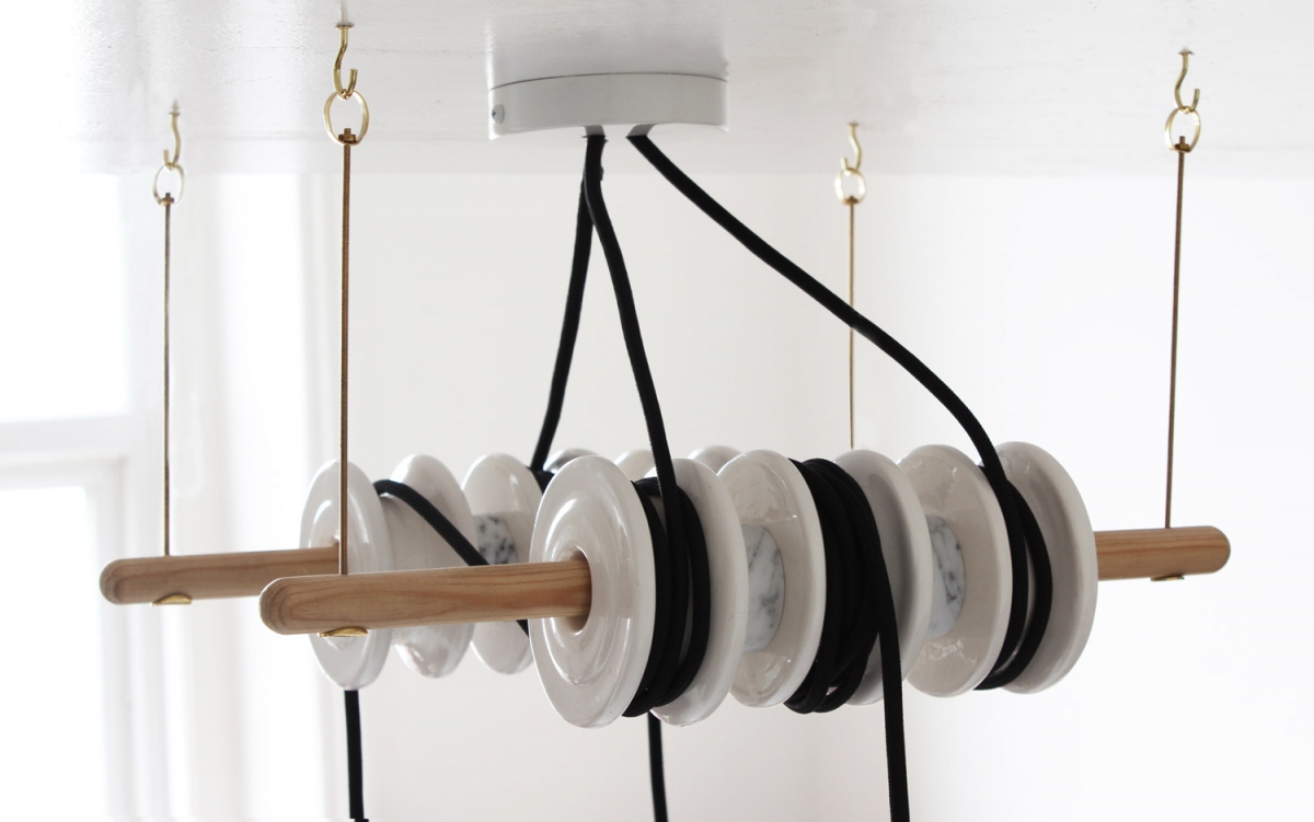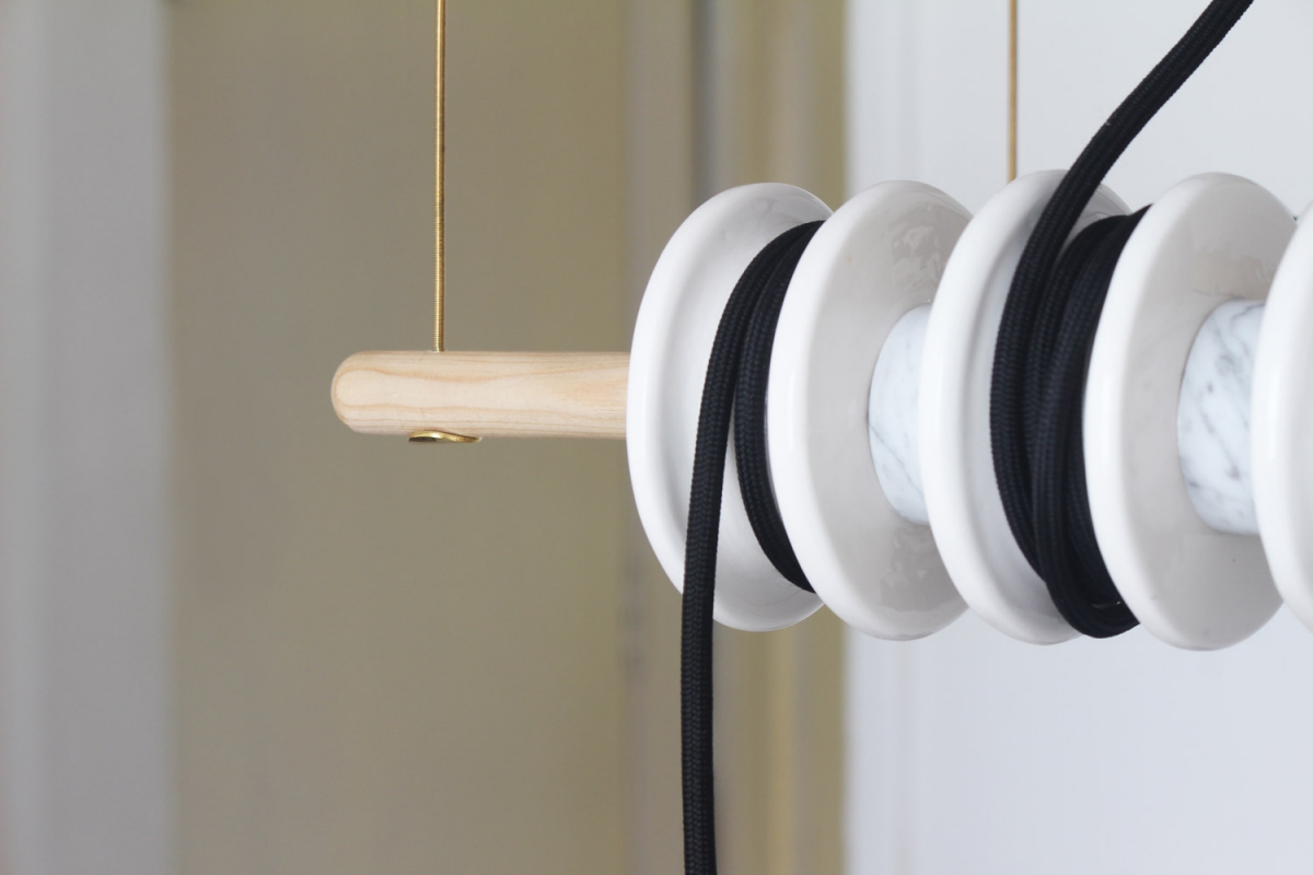 Cable support structure formed by wooden twin axis hosting cilinders of different sizes in marble and ceramic. The system is highly versatile: it allows different illuminance levels, disparate heights and several distributions in the same space.